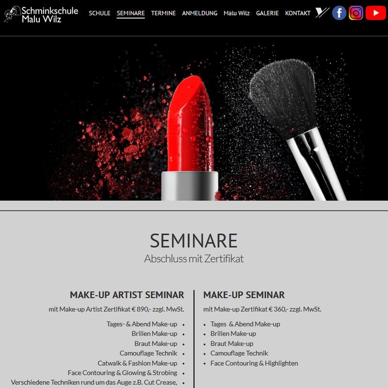 Die Website der Schminkschule Malu-Wilz stellt Aus- und Weiterbildungsmöglichkeiten für Visagist:innen und Make-up-Artists in einem modernen, klar strukturierten Layout vor.